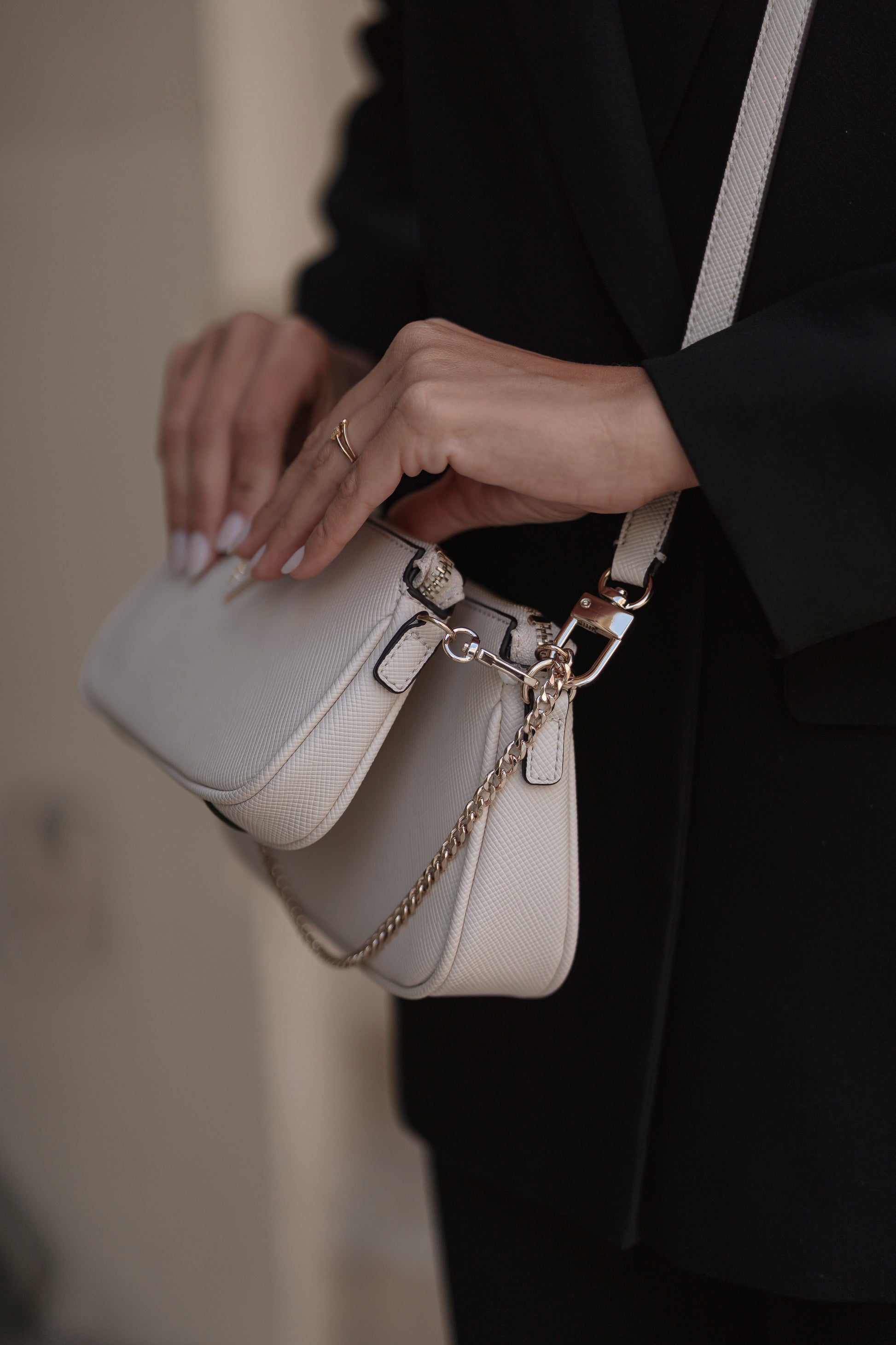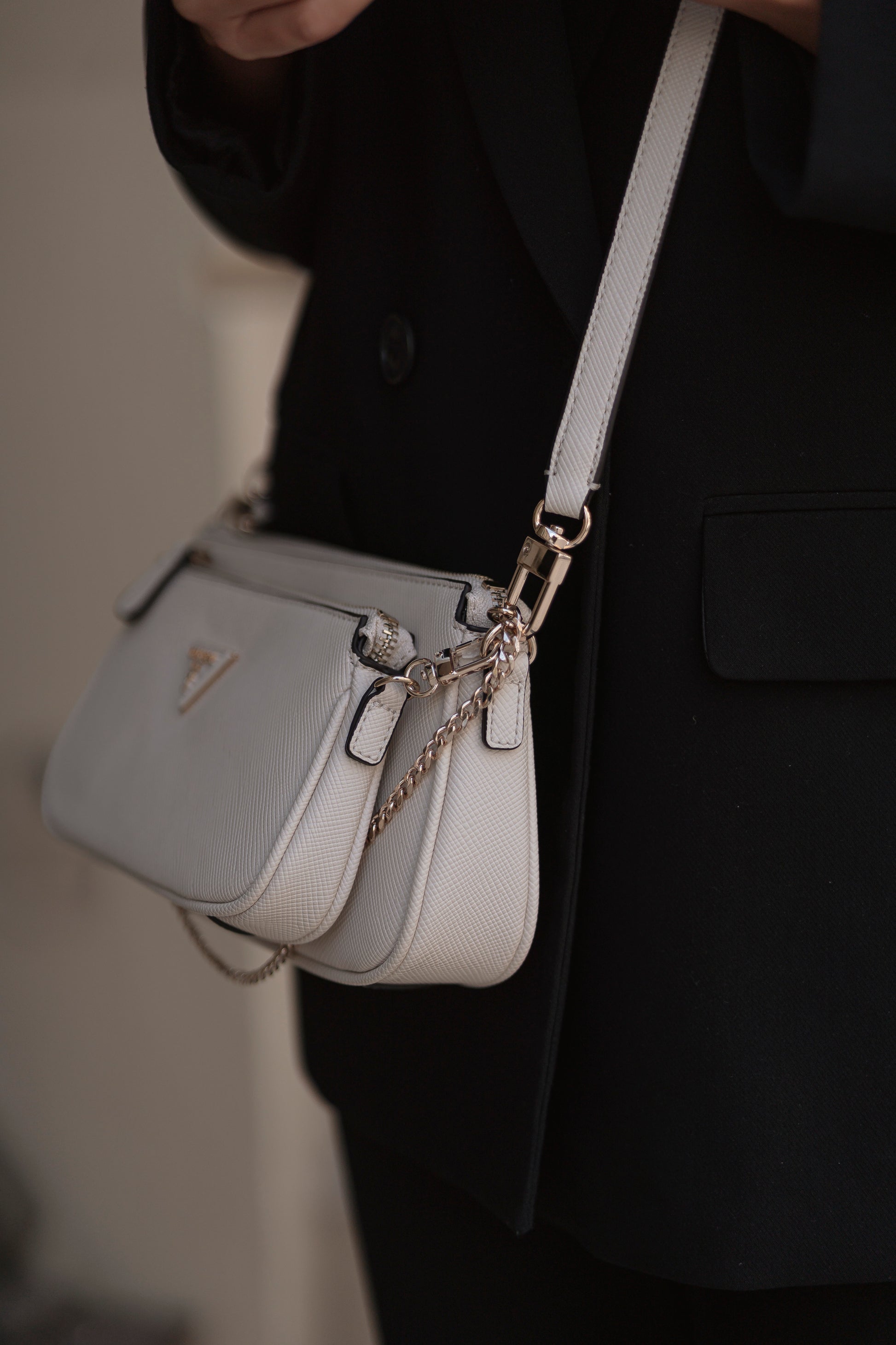 Mala com uma alça tiracolo e outra alça pequena em corrente ambas ajustáveis e removíveis. A mala divide se em duas bolsas que podem ser utilizadas separadas.